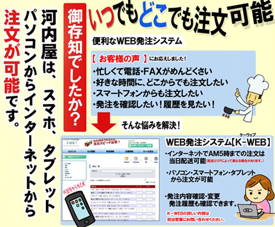 河内屋はお客様からの注文を24時間お待ちしております。めまぐるしく環境の変化する時代に、無駄なく効率的に対応する河内屋の流通システムがお客様をしっかりサポートします。インターネット発注システム[M-LINE]をご利用いただければパソコン・スマートフォン・タブレットでどこからでも注文可能となります。