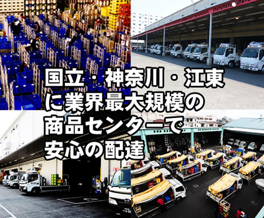 飲食店様専用の酒屋である河内屋の豊富な品揃えと365日は配送を支えるのは、酒類業界最新の機能を備えた国立商品センター江東商品センター、神奈川商品センターです。3つのセンターでは業界最先端の自動ピッキングシステムを導入したことで、誤配・品切れが大幅に減少。さらに業界随一の鮮度を誇っていることも、飲食店様専門の酒屋として徹底して追求しています。
