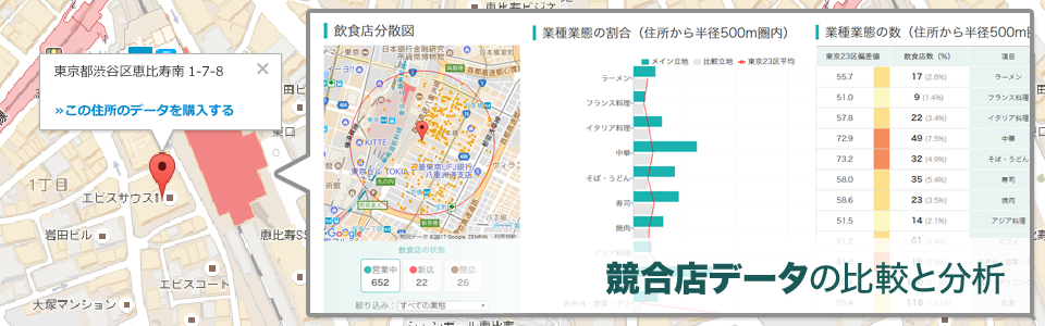 立地データが見れる!調べたいデータを住所検索するだけでなく、営業中の飲食店名の所在地でもピンポイント指定が可能