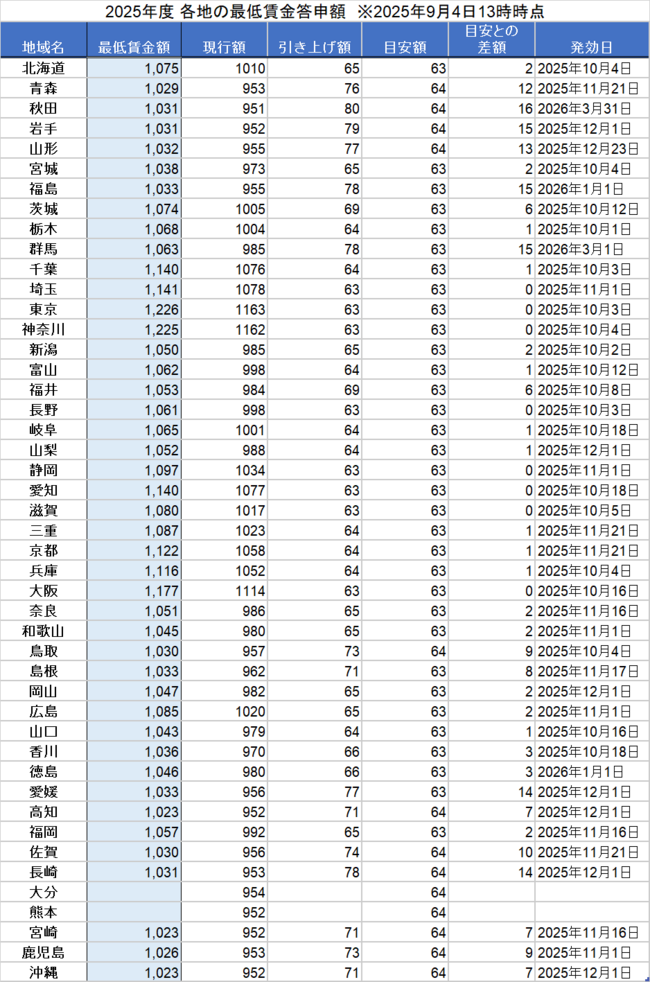 2025年度「最低賃金」、全国の答申額まとめ。1,000円超は確実、発効が来年にずれ込む県も
