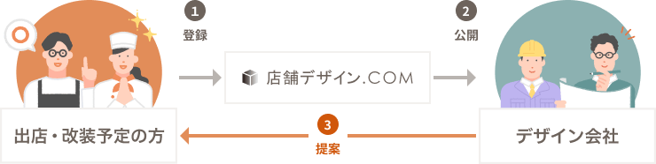 出店/改装したいお店のイメージを登録するだけで、平均7社の内装デザイン会社から提案が届くサービスです。